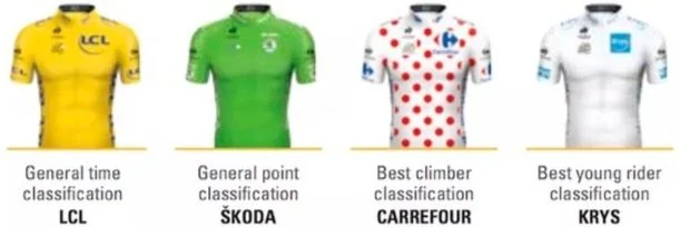 The three other jerseys are green for best sprinter/points classification, polka dot for best climber, and white, best young rider (under 25). Points decide the best sprinter and climber. Specific climbs and sprints are highlighted during each stage, and points are given to those who cross the line first, second, third, etc. The white jersey is for the best-positioned rider under 25 years old.